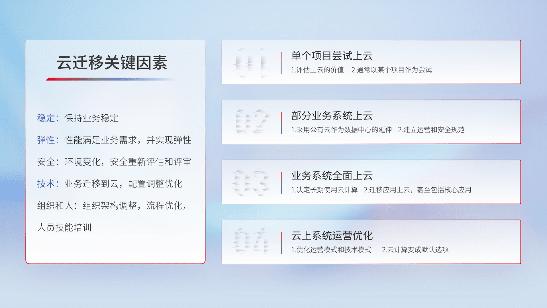 结合实际业务,,,,从规划设计、、、、云平台选型、、云原生改造、、数据迁移、、集成交付,,,,迁移全过程为客户识别最佳上云路径,,,,做好风险识别管理,,设计网络架构、、、身份权限、、、安全审计合规、、、操作审计、、、日志审计、、、、监控告警策略、、多站点容灾设计等,,对云上基础设施进行整体规划,,,提升IT治理水平,,以满足弹性、、高可用、、高性能的需求。。