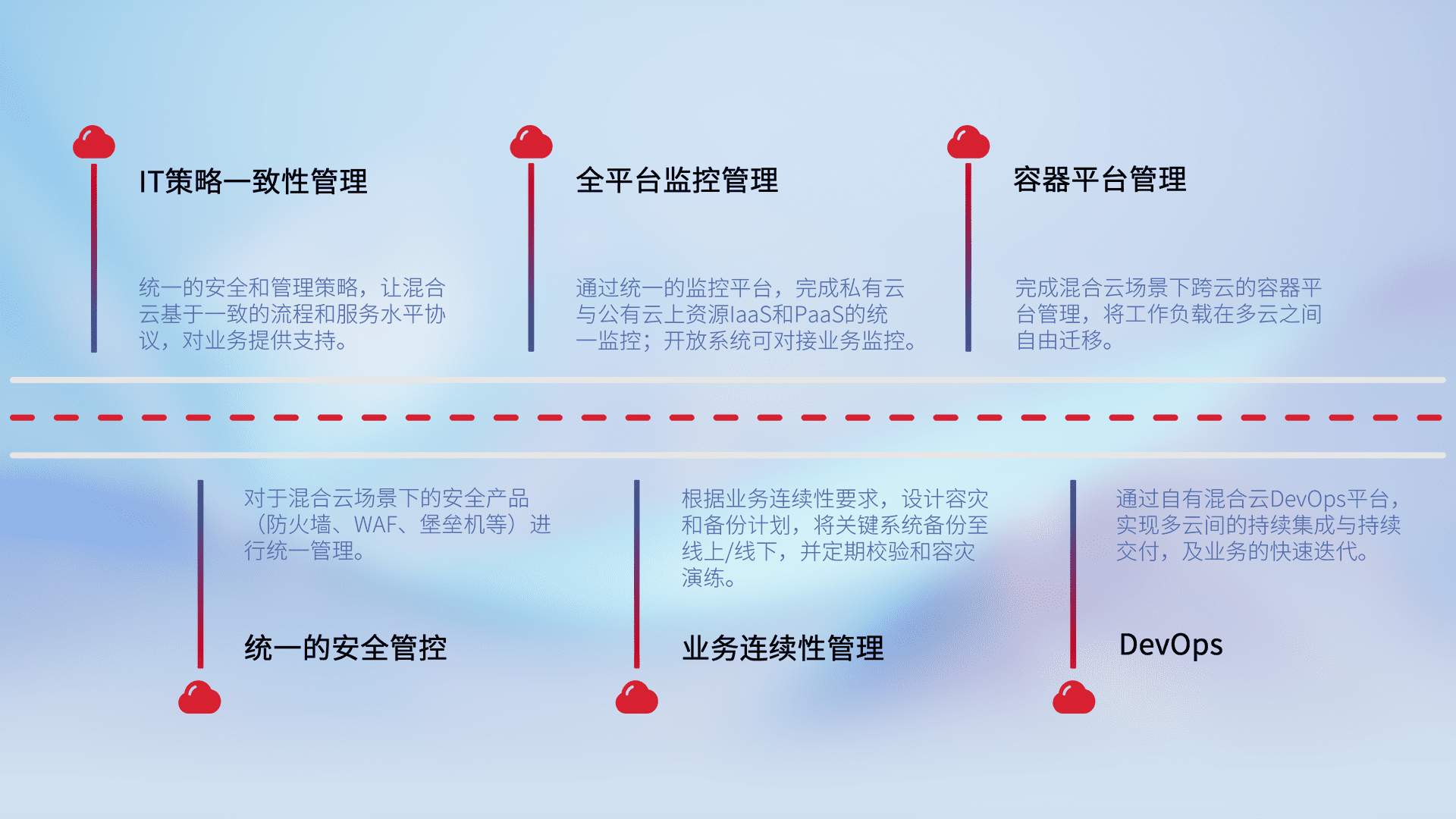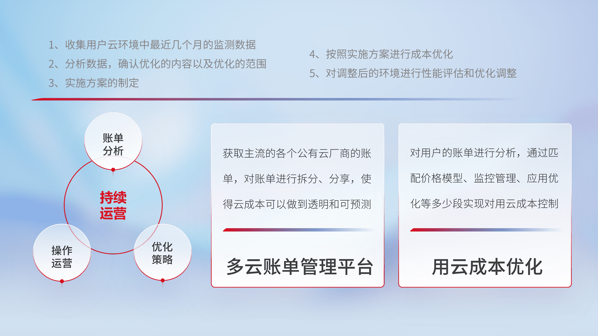 通过多云纳管,,,以统一的资源数据模型把客户的云资源进行抽象和封装,,进而实现对多云资源的统一操作,,,保障云资源管理的可靠性、、、稳定性与可用性。。。量身定制化运维内容,,,配置、、开发运维、、、补丁管理、、、备份、、、监控、、、认证和访问管理、、审计和日常巡检等,,保障在用云过程中的可靠度,,,稳定度以及高可用率。。