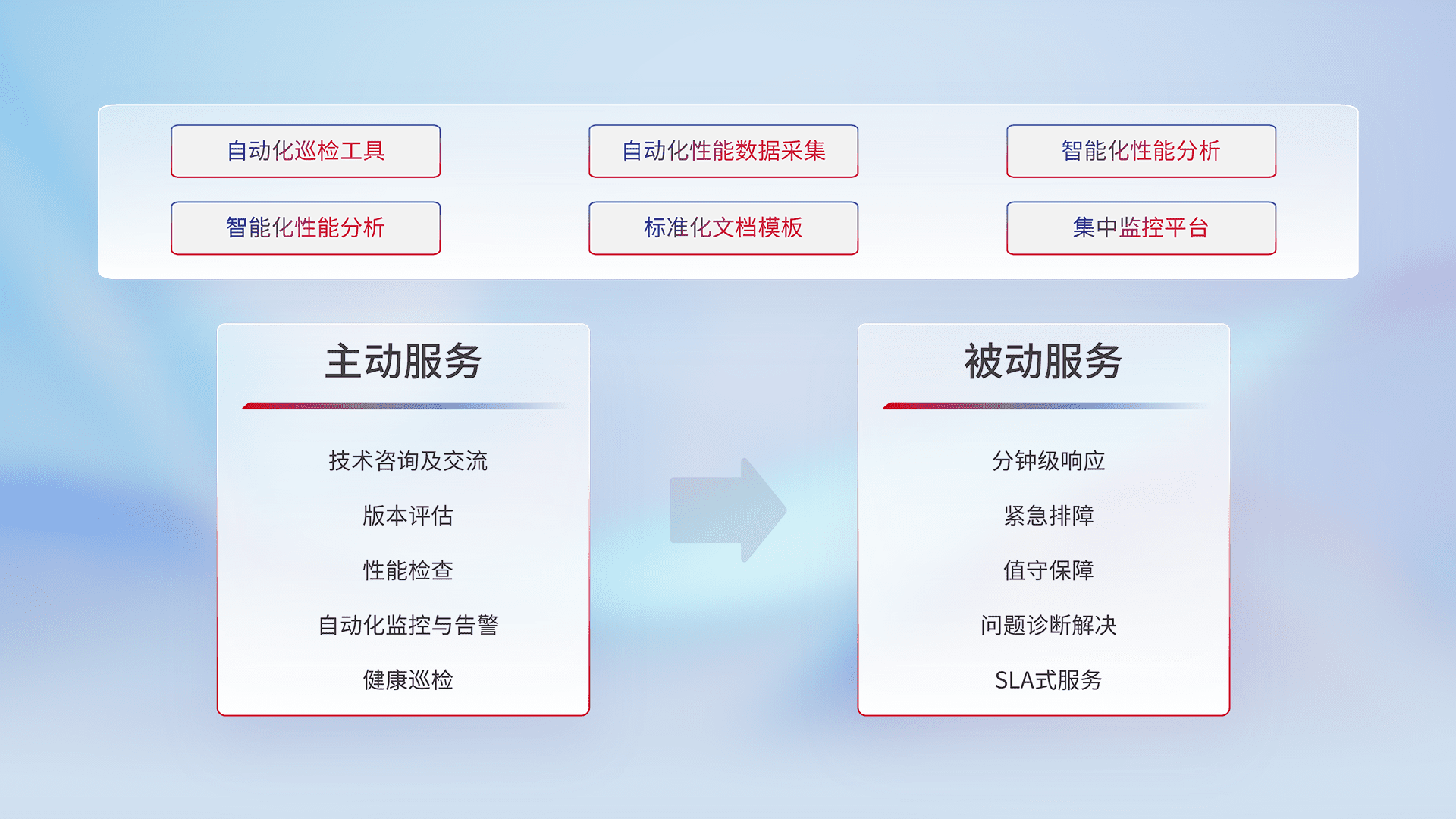 智能化工具和标准化文档,,,保障服务质量,,提供主动服务(包含技术咨询、、版本评估、、性能检查、、自动化监控与告警、、健康巡检)和被动服务包含(分钟级响应、、、、紧急排障、、、值守保障、、问题诊断解决、、SLA服务)。。。