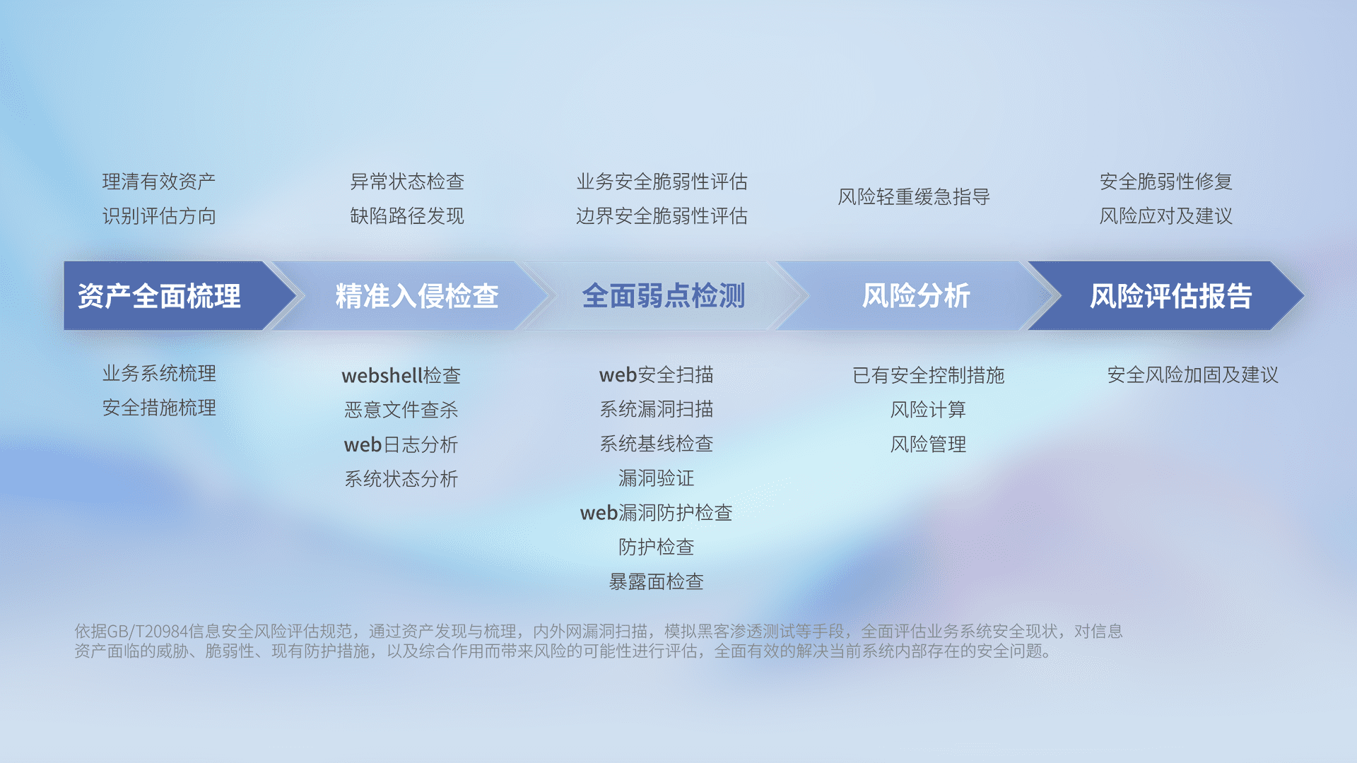 针对客户行业特性,,,以专业的安全服务+多厂商联合解决方案提供专属的一站式安全管理服务,,,帮助客户全面感知网络空间威胁,,基于识别、、、、检测、、分析、、、、防护、、、、监测、、、、响应的服务理论模型,,,从方案咨询、、、、集成交付、、、、评估验证、、优化加固、、、、运维运营,,,,致力于为客户提供完整的闭环管理式安全服务。。。以实战经验为客户打造高抵御风险的安全体系,,帮助客户发现威胁、、、对抗威胁、、、、处置威胁,,不断积累安全对抗能力,,,持续保障数字化安全。。