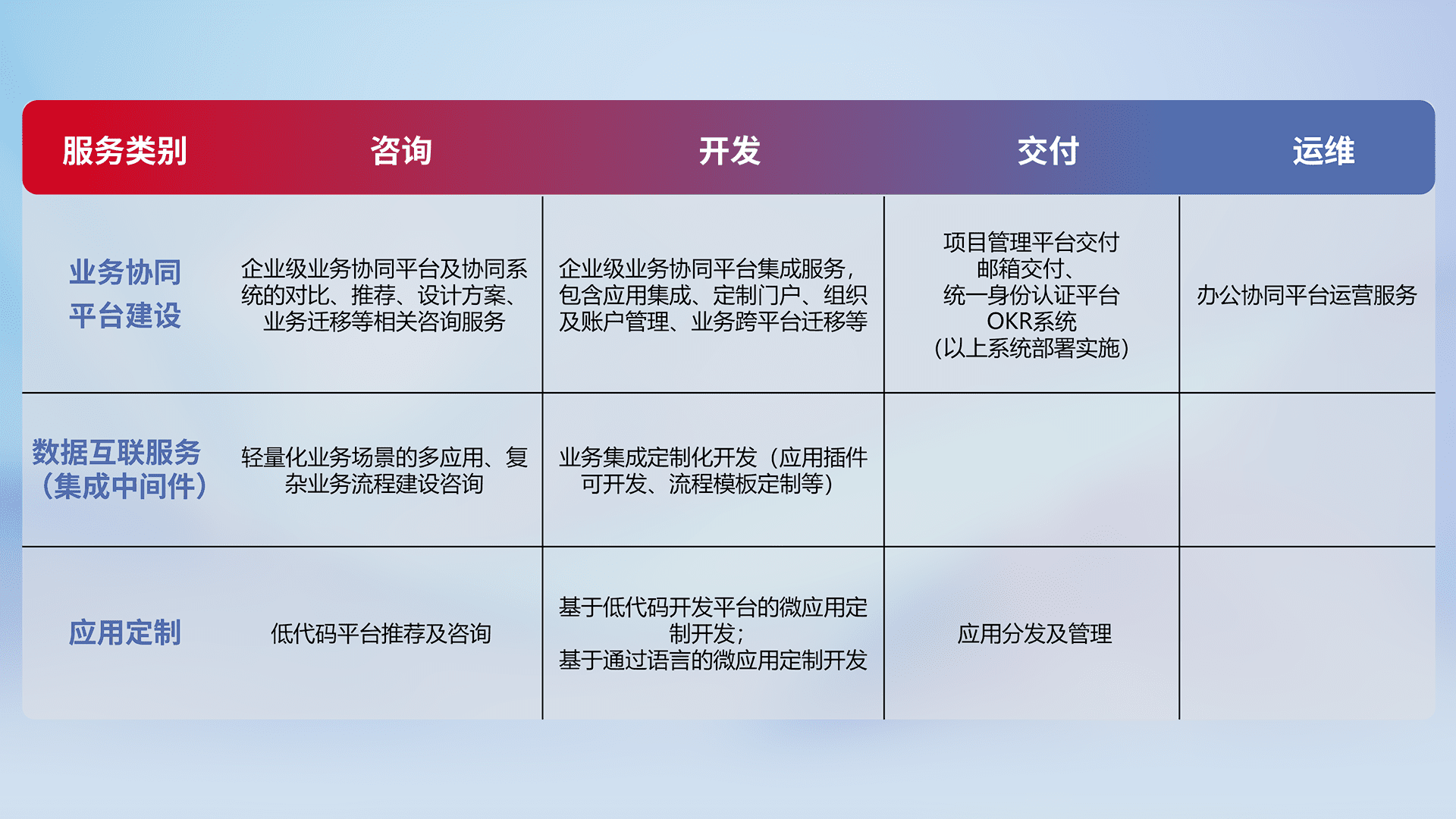 针对钉钉、、、、企微、、、、IDaas等平台级产品提供产品的规划、、、、方案、、、、交付、、定制化开发等服务,,实现如统一协同办公、、、、智能客户服务、、混合会议管理、、、、智能数据查询、、等业务场景,,,,实现数字化转型。。。。